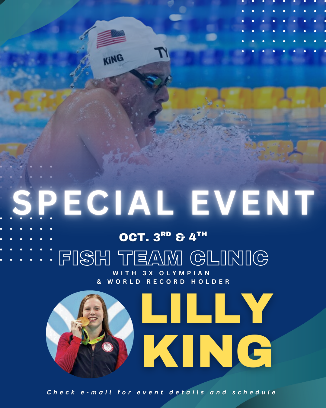 - All AG swimmers: 5:00–6:00 PM — Get ready to meet Lilly and work directly with her on your skills!